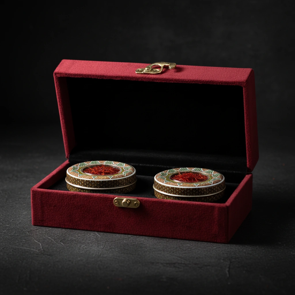 De saffraan wordt gepresenteerd in traditionele Khatam-blikjes, met ingewikkelde geometrische patronen die getuigen van eeuwenlang Perzisch vakmanschap. Deze prachtige blikken zijn niet alleen verpakkingen; het zijn aandenkens die een eerbetoon zijn aan de kostbare specerijen die erin zitten. De combinatie van het rijke fluweel, de ambachtelijke blikken en ’s werelds beste saffraan maakt deze geschenkset tot een compleet zintuiglijk genot.