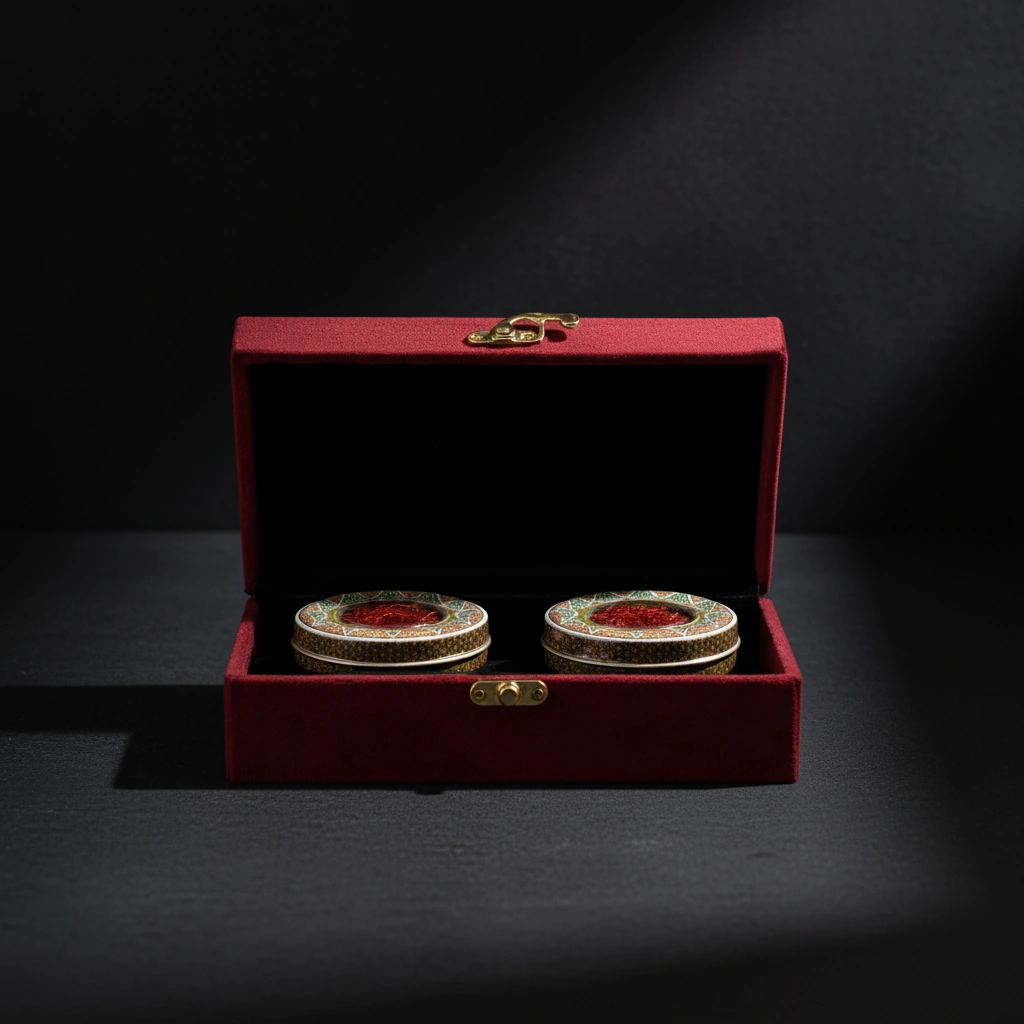 Ontdek het perfecte gebaar van waardering met deze unieke saffraan geschenkset 2g, speciaal ontworpen om te delen. Deze set zit in een prachtige roodfluwelen doos en straalt meteen een gevoel van elegantie en prestige uit. De luxueuze buitenkant opent om niet één, maar twee perfect op elkaar afgestemde schatten te onthullen, waardoor het een ideaal cadeau is voor koppels, goede vrienden of als een verfijnd bedrijfsgeschenk.